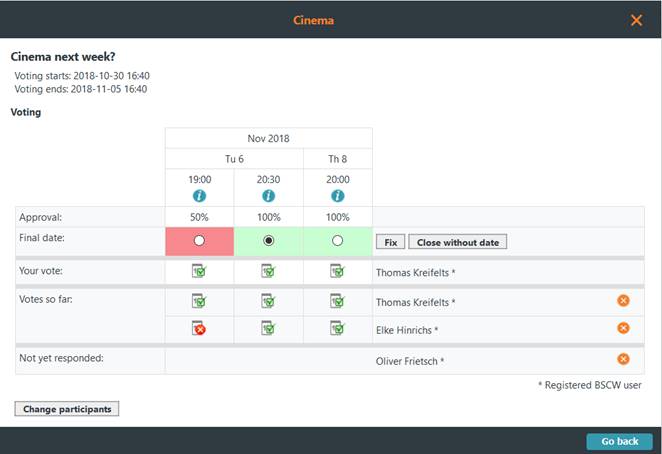 An appointment scheduling helps in finding an agreeable date for a group appointment. The organizer of such a group appointment creates an appointment scheduling specifying possible dates and participants of the appointment. Participants may be registered BSCW users as well as other persons. The participants are notified via e-mail and may then vote on the dates proposed as long as the voting period has not expired. Further participants may be proposed for the appointment. The organizer determines the final date of the appointment, depending on the outcome of the voting. All participants are notified about the final date, which may then be transferred to a BSCW calendar or exported to other calendar systems.