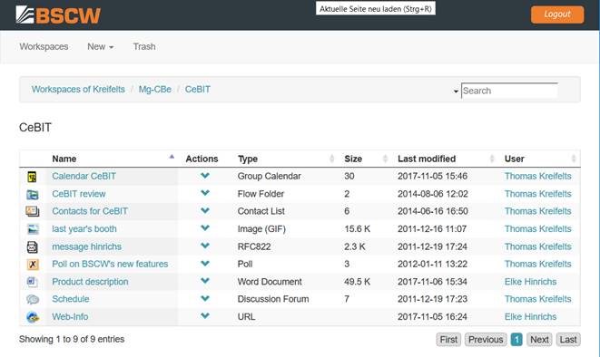 Note: Some BSCW objects like calendars, workspace portals or website folders have no simplified representation. When you open such an object it will be shown in the normal representation. Opening a simple folder will you bring back to the simplified user interface.