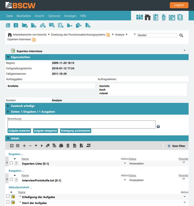 Abbildung 27 zeigt die Beispielaufgabe nach der Erledigung. Als Auftragnehmer können Sie jetzt nur noch weitere Auftragnehmer hinzuziehen, etwa zur Information für spätere Projektphasen ([Aufgabe zuweisen]), die Aufgabe an andere Auftragnehmer delegieren, etwa weil Sie in Urlaub gehen ([Aufgabe delegieren]) oder die [Erledigung zurückziehen]. Mit der letzteren Aktion erhalten Sie die Möglichkeit, wieder Änderungen an den Ausgabedaten, hier also den Interview-Protokollen, vorzunehmen und dann erneut die Aufgabe zu erledigen (siehe auch den folgenden Abschnitt).