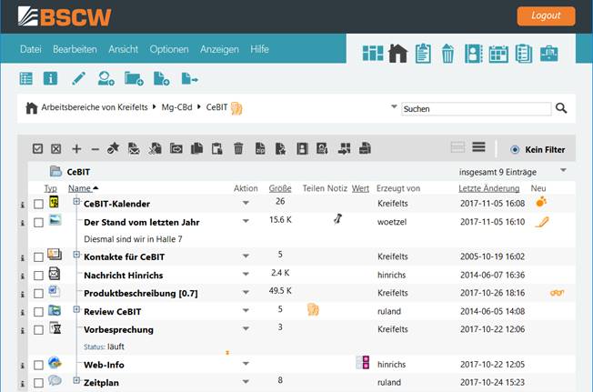 In der Web-basierten Benutzeroberfläche zeigt BSCW den Inhalt eines Ordners oder eines Arbeitsbereichs im Mittelteil einer Übersichtsseite an. Darüber befindet sich ein Kopfteil, der Popup-Menüs und mit Symbolen versehene Schaltflächen (‚buttons‘) enthält.