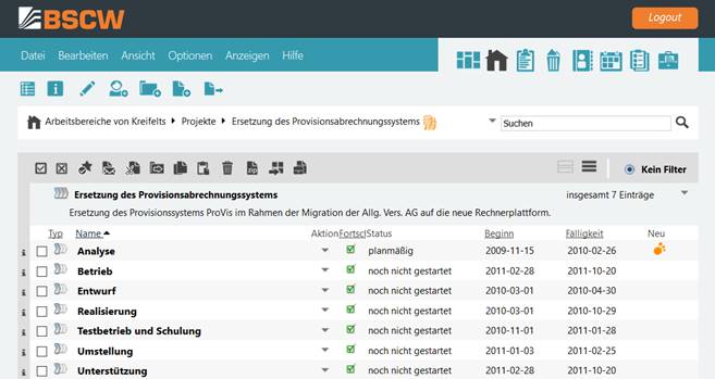 Wählen Sie über im oberen Menü in der Abteilung ‚Spalten‘ ‚Beginn‘, ‚Fälligkeit‘ und ‚Fortschritt‘ aus, damit diese Phasen- und Projekteigenschaften auch in der Ordnerübersicht angezeigt werden. Die Fälligkeit einer Phase entspricht dem geplanten Fertigstellungstermin.